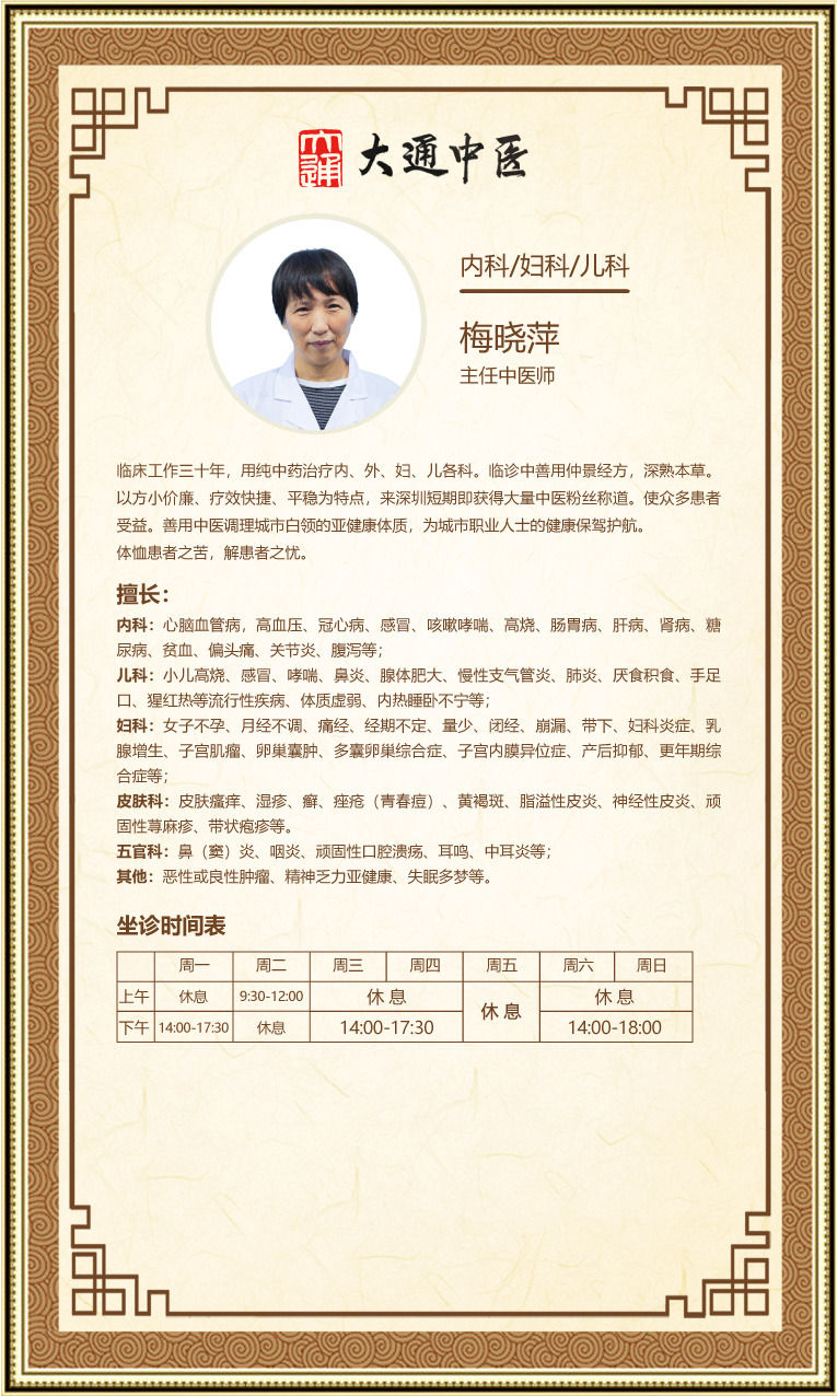 出诊时间:每周一、周三、周四、周五、周六、周日 下午 14:00-17:30 周二上午09:00-12:00